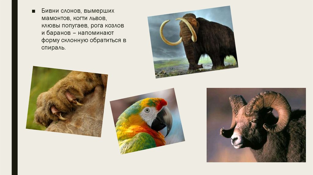 ■ Бивни слонов, вымершихмамонтов, когти львов,