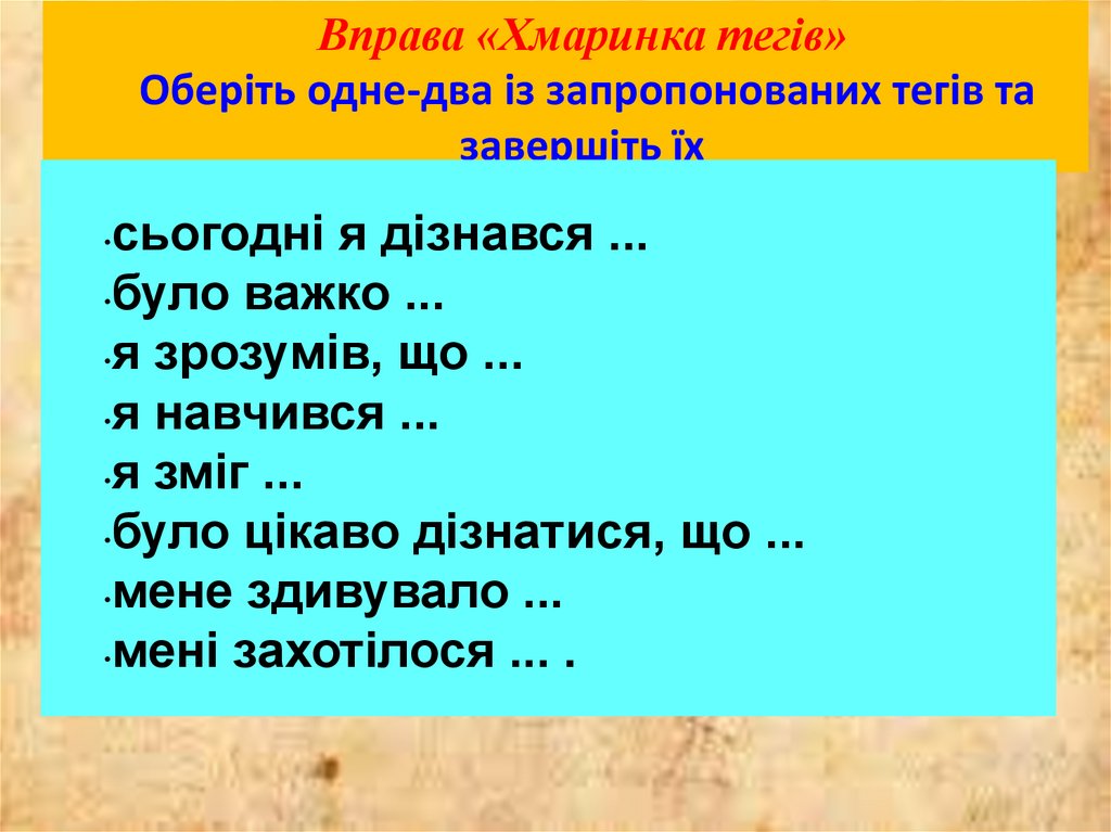 Вправа «Хмаринка тегів»Оберіть одне-два із запропонованих тегів та
