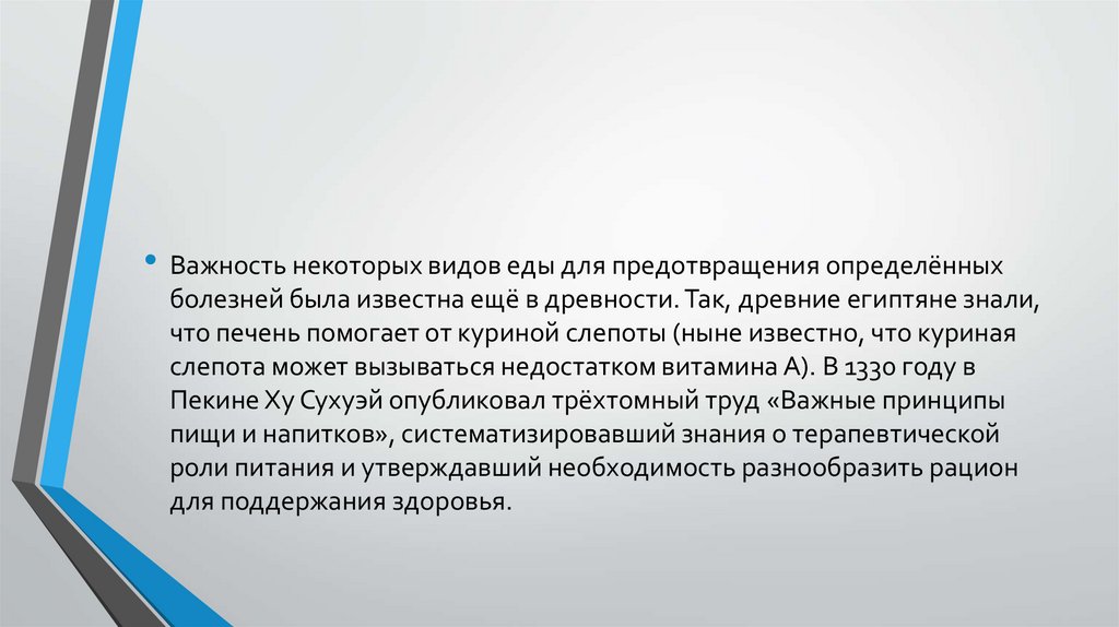 • Важность некоторых видов еды для предотвращения определённыхболезней была известна ещё в древности. Так, древние египтяне знали,