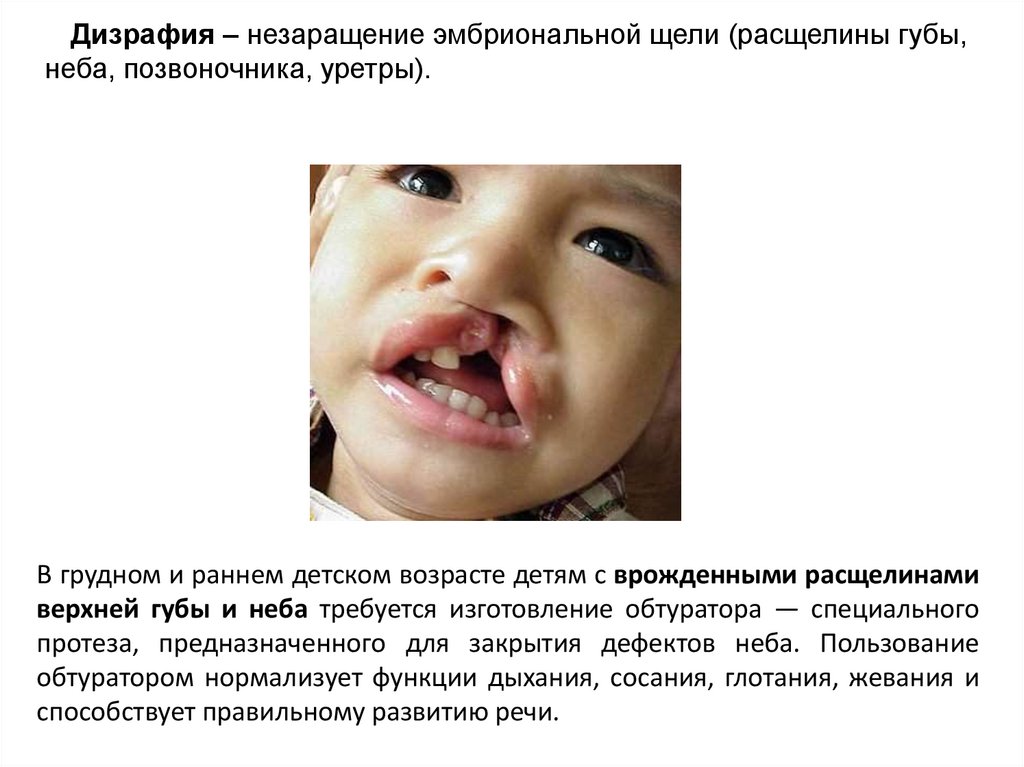 Дизрафия – незаращение эмбриональной щели (расщелины губы,неба, позвоночника, уретры).