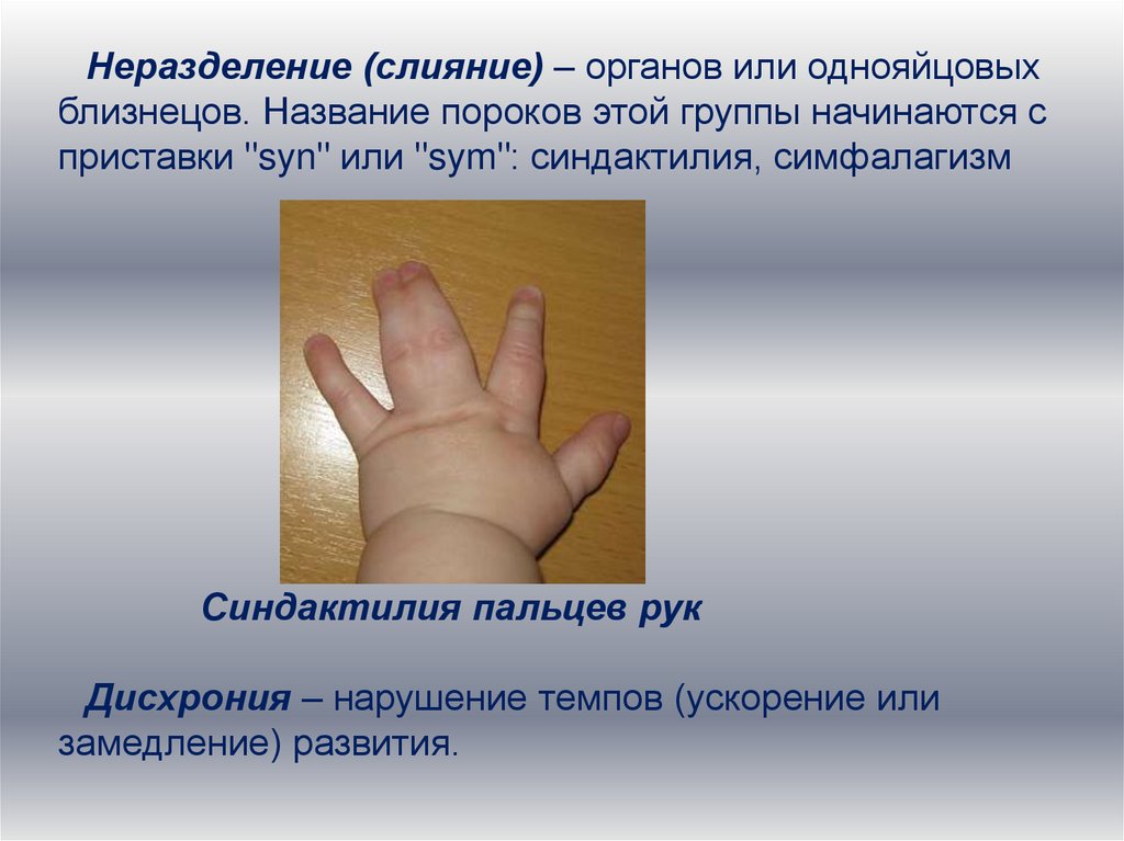 приставки "syn" или "sym": синдактилия, симфалагизм