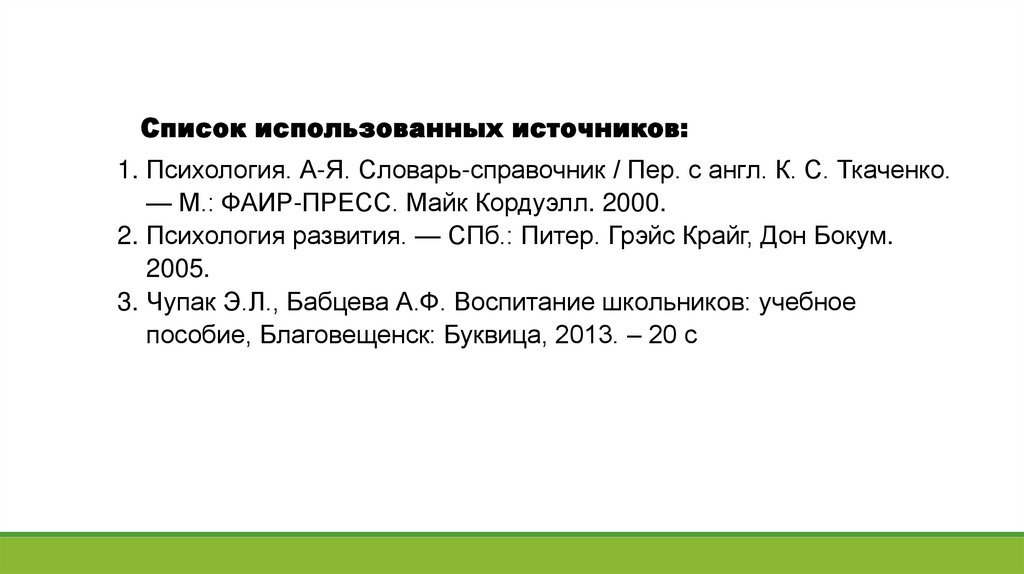 Список использованных источников:1. Психология. А-Я. Словарь-справочник / Пер. с англ. К. С. Ткаченко.