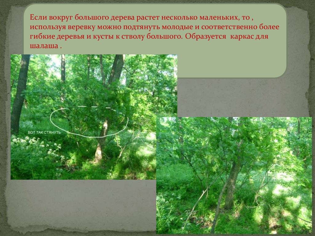 Если вокруг большого дерева растет несколько маленьких, то ,используя веревку можно подтянуть молодые и соответственно более