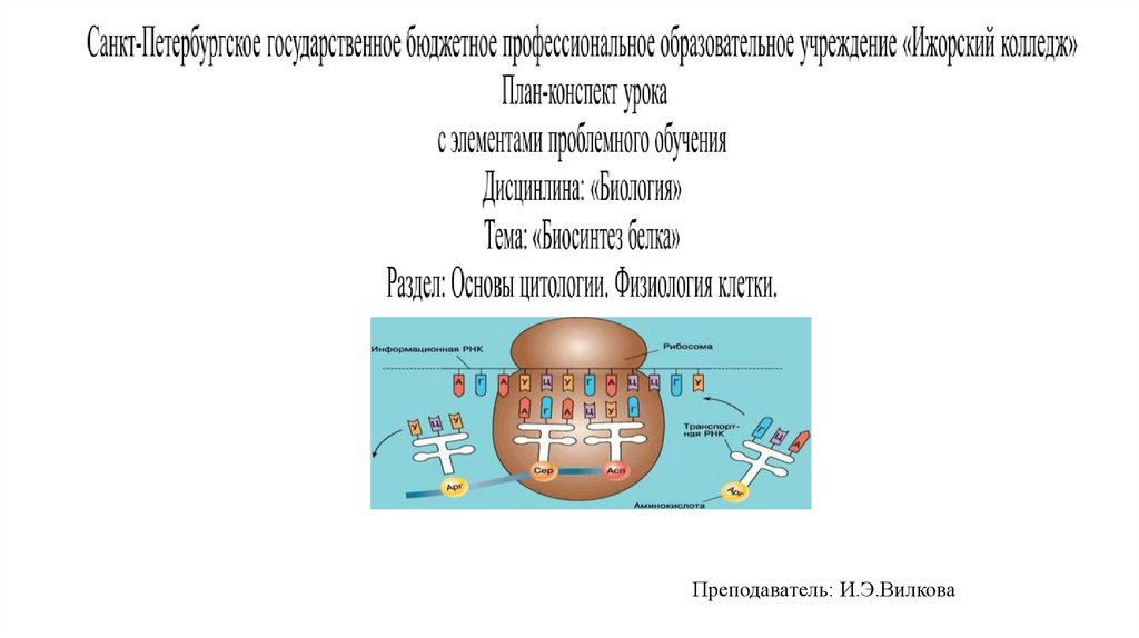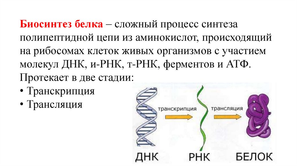 Биосинтез белка – сложный процесс синтезаполипептидной цепи из аминокислот, происходящий