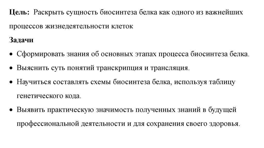 Цель: Раскрыть сущность биосинтеза белка как одного из важнейшихпроцессов жизнедеятельности клеток