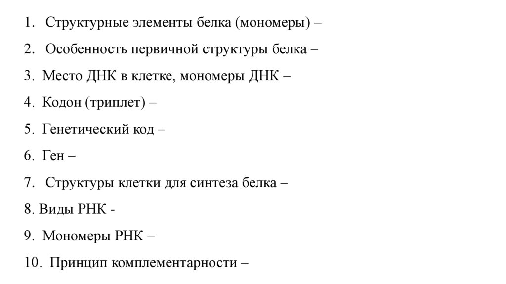 1. Структурные элементы белка (мономеры) – аминокислоты2. Особенность первичной структуры белка – порядок соединения АК