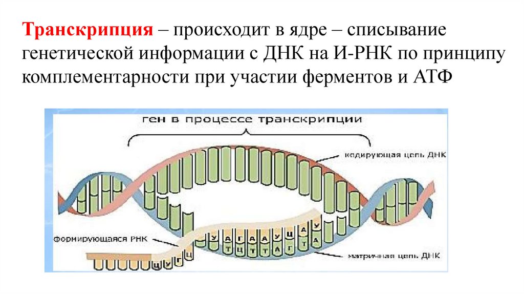 Транскрипция – происходит в ядре – списываниегенетической информации с ДНК на И-РНК по принципу