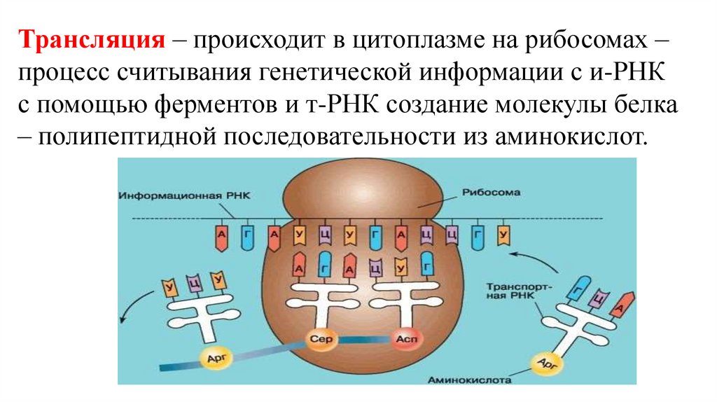 Трансляция – происходит в цитоплазме на рибосомах –процесс считывания генетической информации с и-РНК