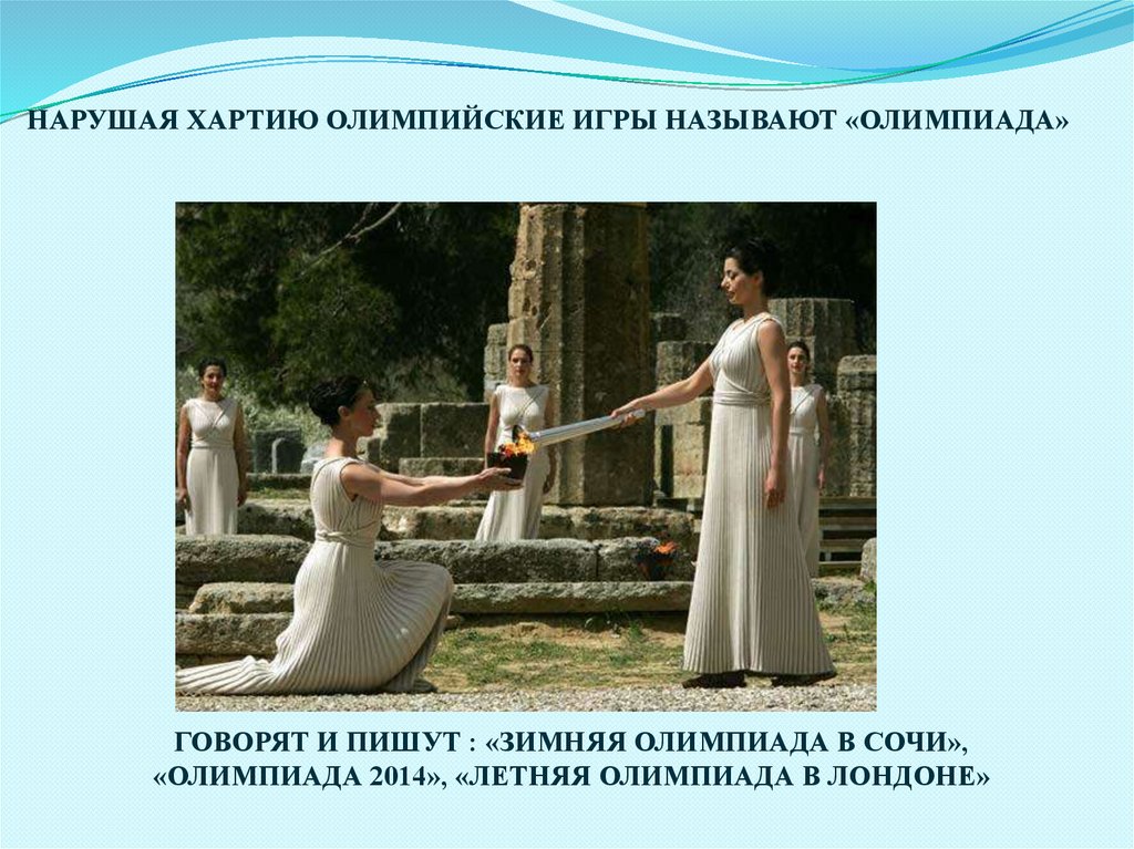 НАРУШАЯ ХАРТИЮ ОЛИМПИЙСКИЕ ИГРЫ НАЗЫВАЮТ «ОЛИМПИАДА»ГОВОРЯТ И ПИШУТ : «ЗИМНЯЯ ОЛИМПИАДА В СОЧИ»,