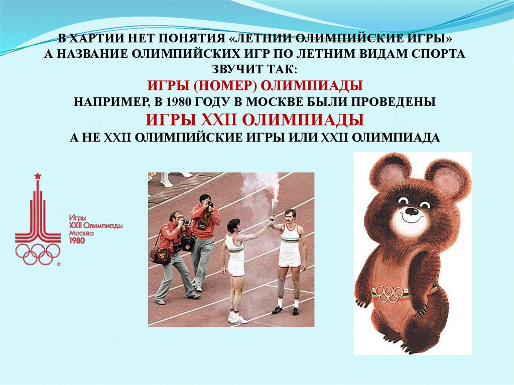 В ХАРТИИ НЕТ ПОНЯТИЯ «ЛЕТНИИ ОЛИМПИЙСКИЕ ИГРЫ»А НАЗВАНИЕ ОЛИМПИЙСКИХ ИГР ПО ЛЕТНИМ ВИДАМ СПОРТА