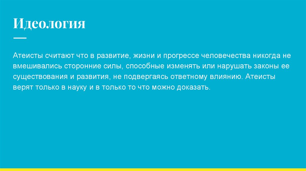ИдеологияАтеисты считают что в развитие, жизни и прогрессе человечества никогда не