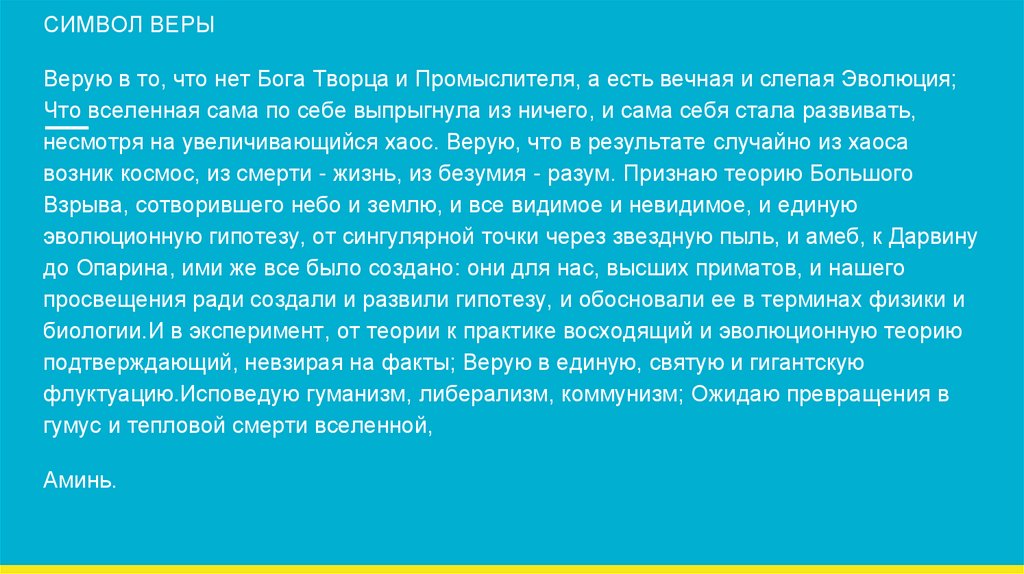 СИМВОЛ ВЕРЫВерую в то, что нет Бога Творца и Промыслителя, а есть вечная и слепая Эволюция;