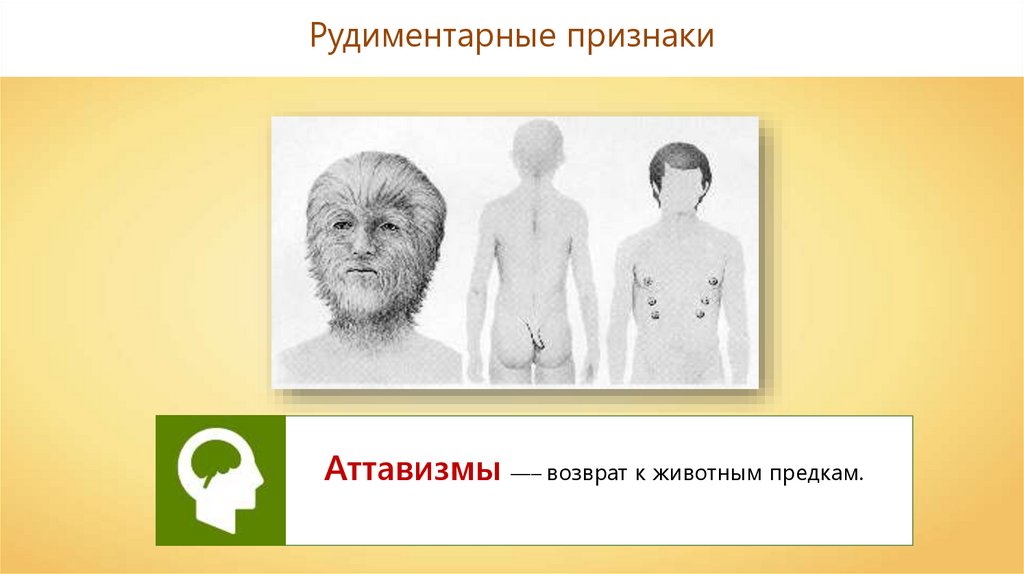 Рудиментарные признакиАттавизмы —– возврат к животным предкам.