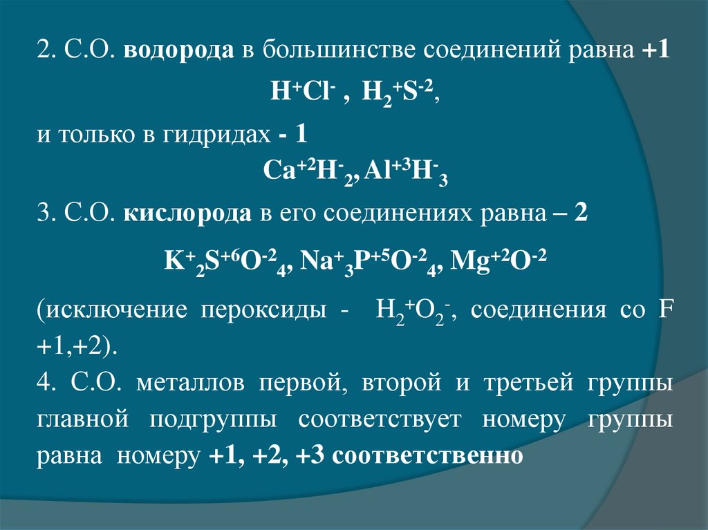 2. С.О. водорода в большинстве соединений равна +1H+Cl- , H2+S-2,