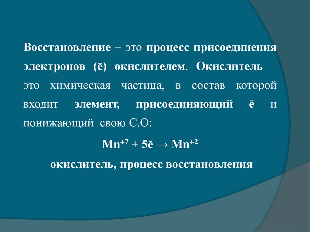 Восстановление – это процесс присоединенияэлектронов (ē) окислителем. Окислитель –