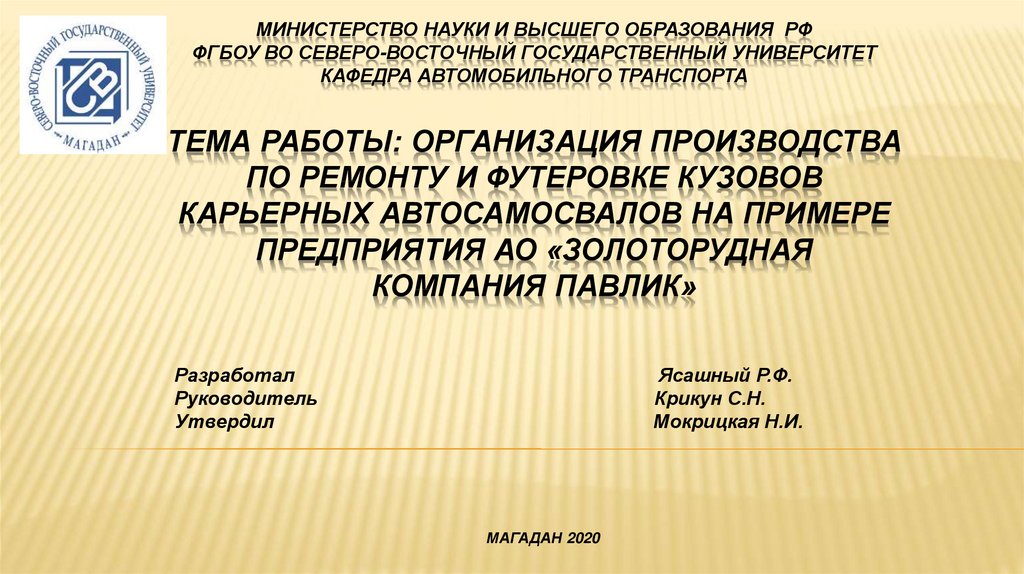 1. МИНИСТЕРСТВО НАУКИ И ВЫСШЕГО ОБРАЗОВАНИЯ РФ ФГБОУ ВО Северо-Восточный государственный университет Кафедра Автомобильного