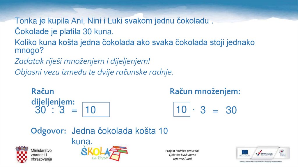 Tonka je kupila Ani, Nini i Luki svakom jednu čokoladu .Čokolade je platila 30 kuna.