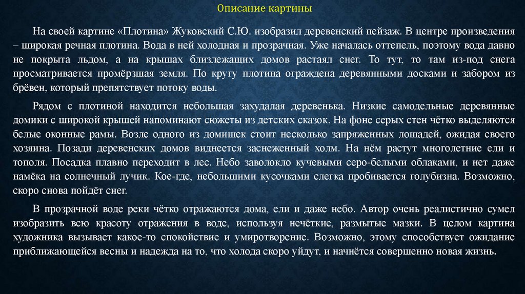 Описание картиныНа своей картине «Плотина» Жуковский С.Ю. изобразил деревенский пейзаж. В центре произведения