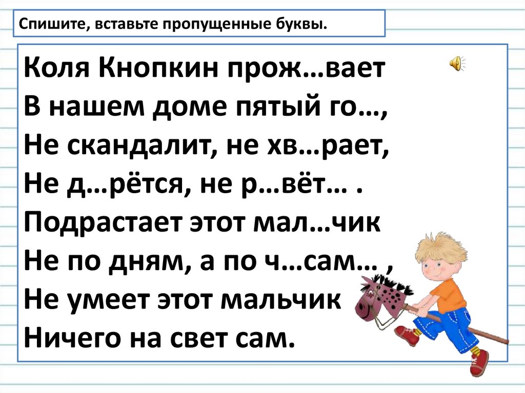 Спишите, вставьте пропущенные буквы.Коля Кнопкин прож…вает