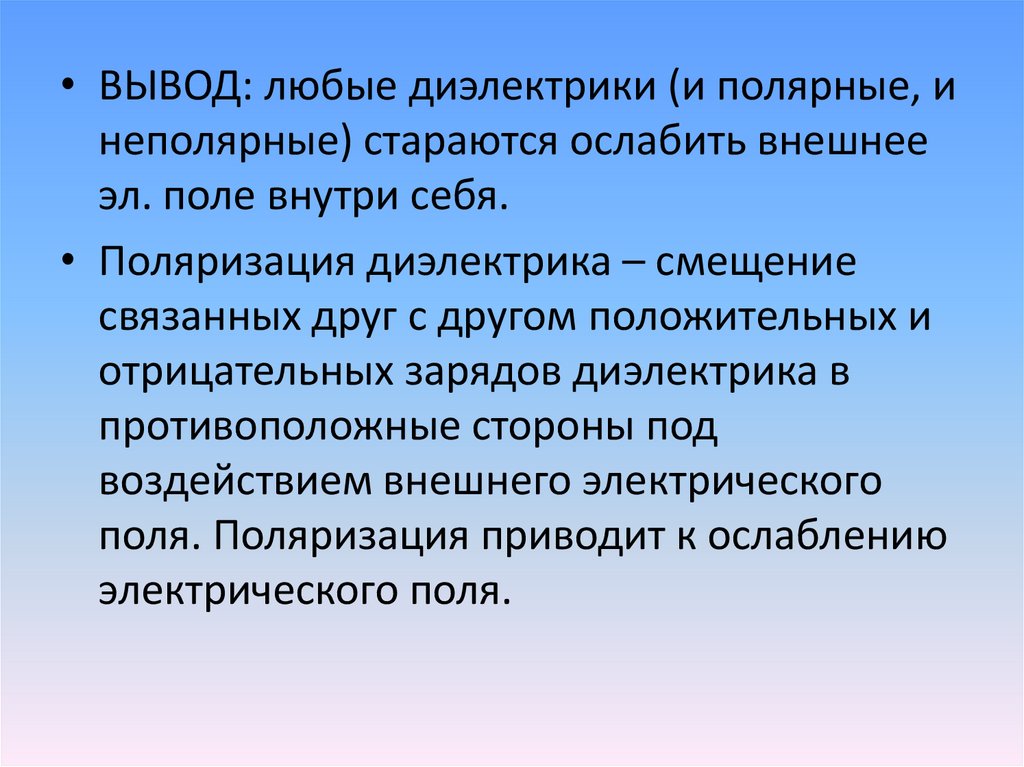 • ВЫВОД: любые диэлектрики (и полярные, инеполярные) стараются ослабить внешнее