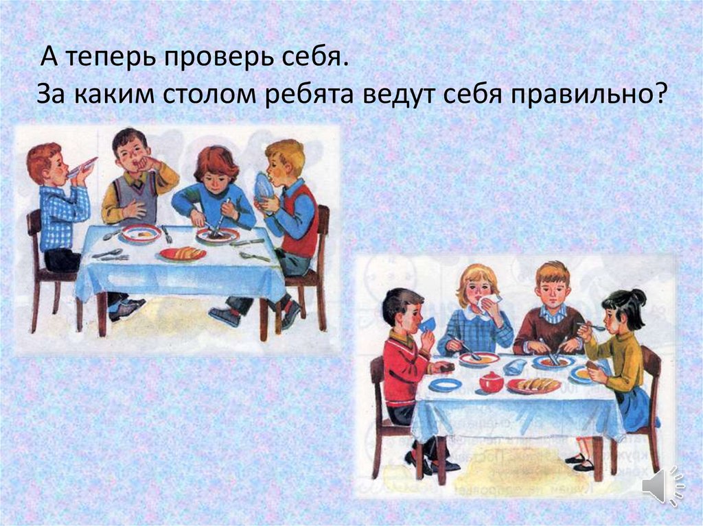 А теперь проверь себя.За каким столом ребята ведут себя правильно?