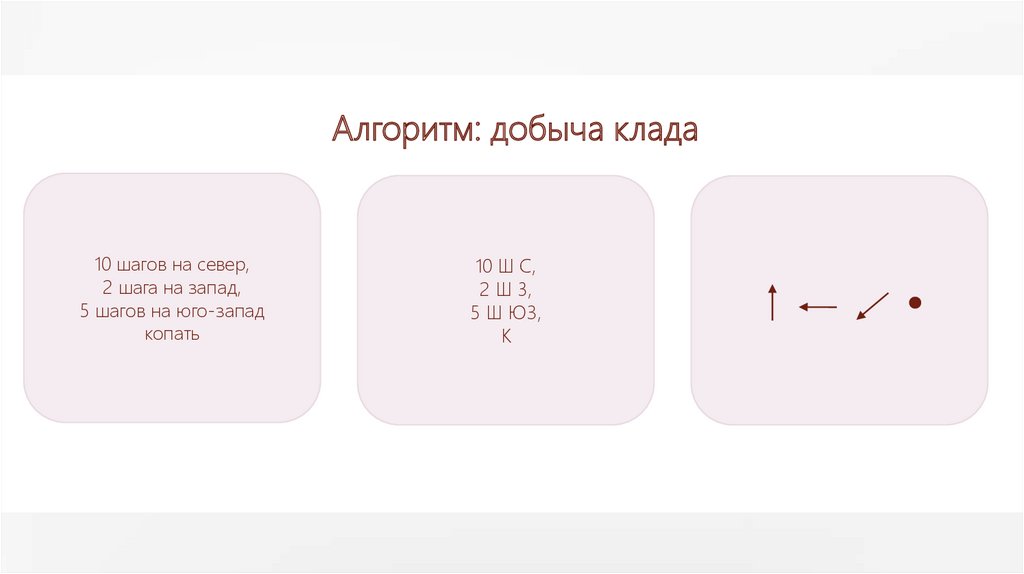 Алгоритм: добыча клада10 шагов на север,