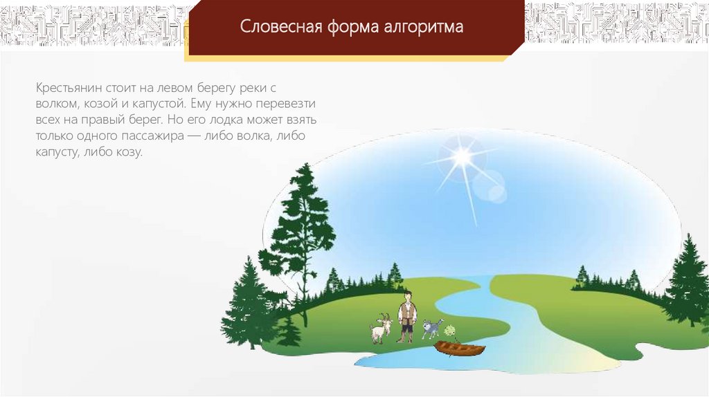 Словесная форма алгоритмаКрестьянин стоит на левом берегу реки с