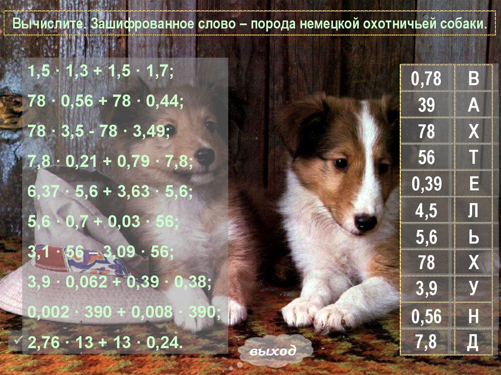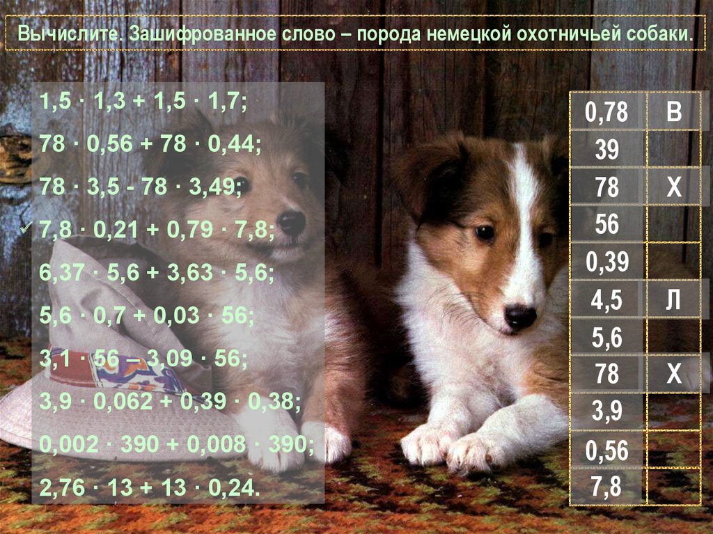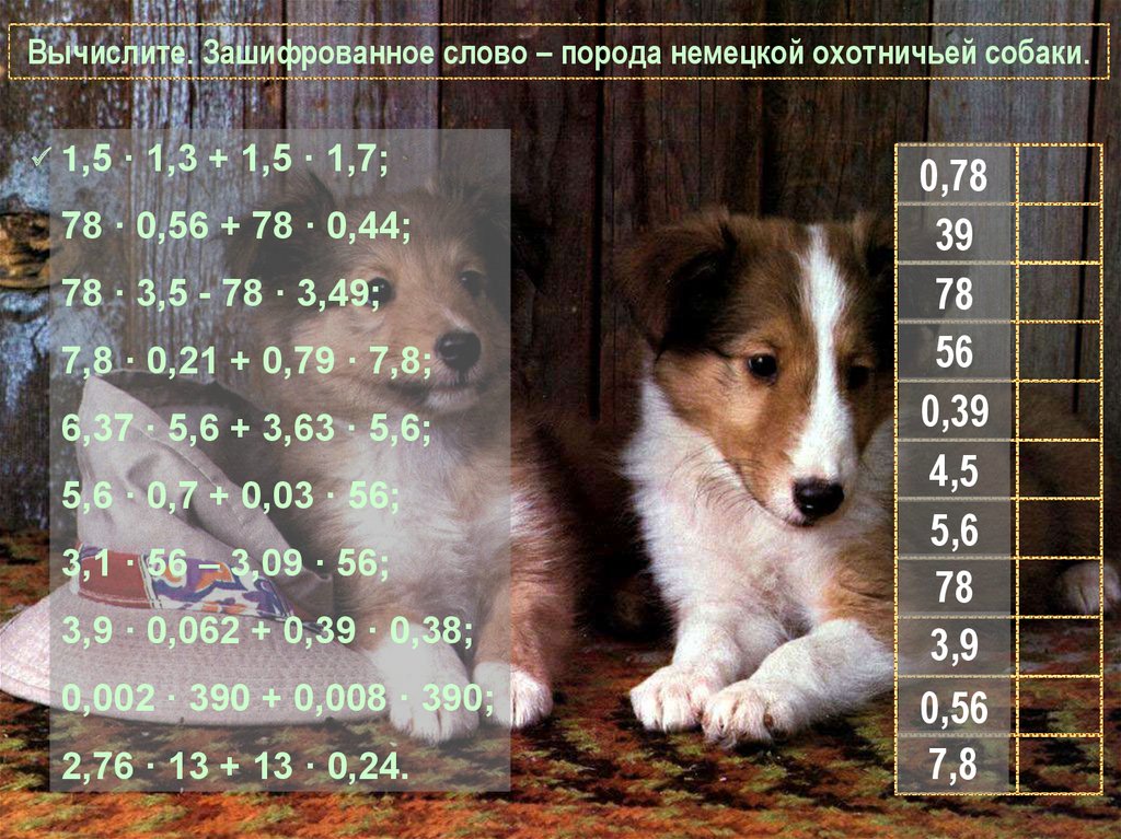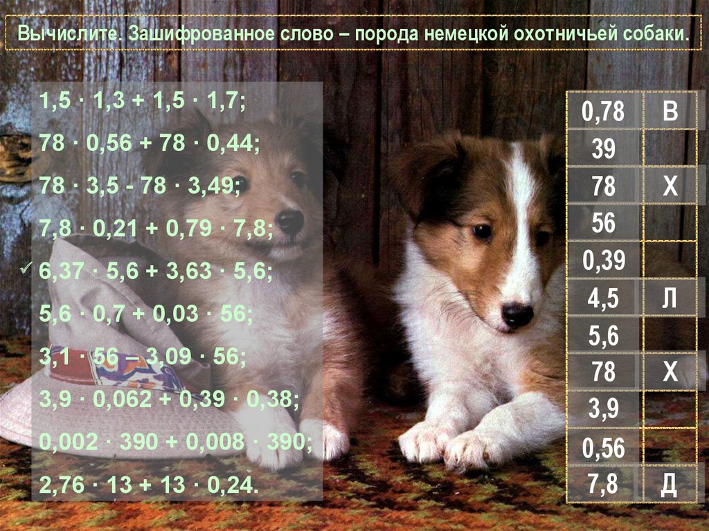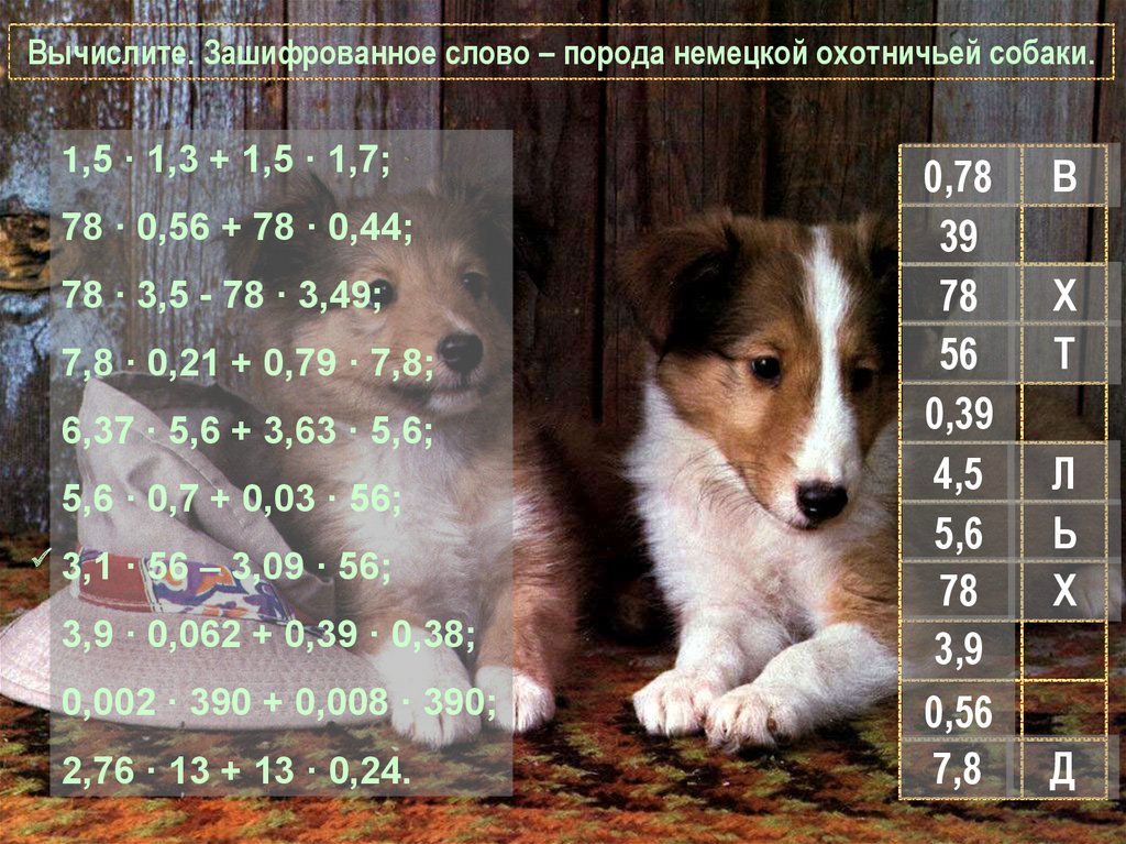 Вычислите. Зашифрованное слово – порода немецкой охотничьей собаки.1,5 · 1,3 + 1,5 · 1,7;