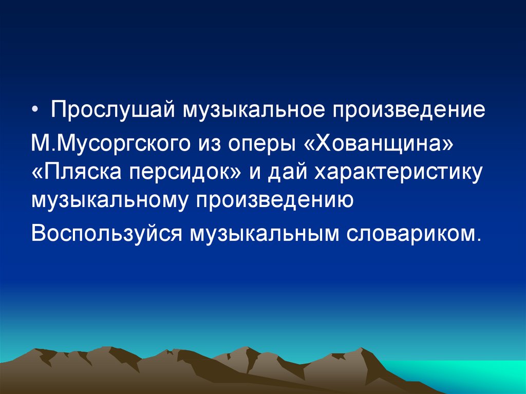 • Прослушай музыкальное произведениеМ.Мусоргского из оперы «Хованщина»