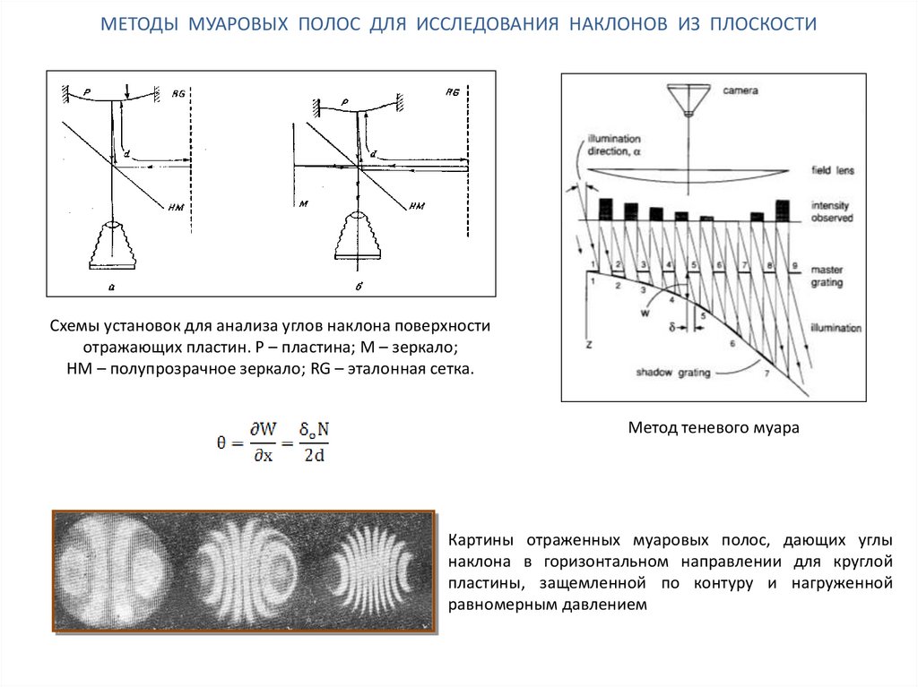 МЕТОДЫ МУАРОВЫХ ПОЛОС ДЛЯ ИССЛЕДОВАНИЯ НАКЛОНОВ ИЗ ПЛОСКОСТИСхемы установок для анализа углов наклона поверхности