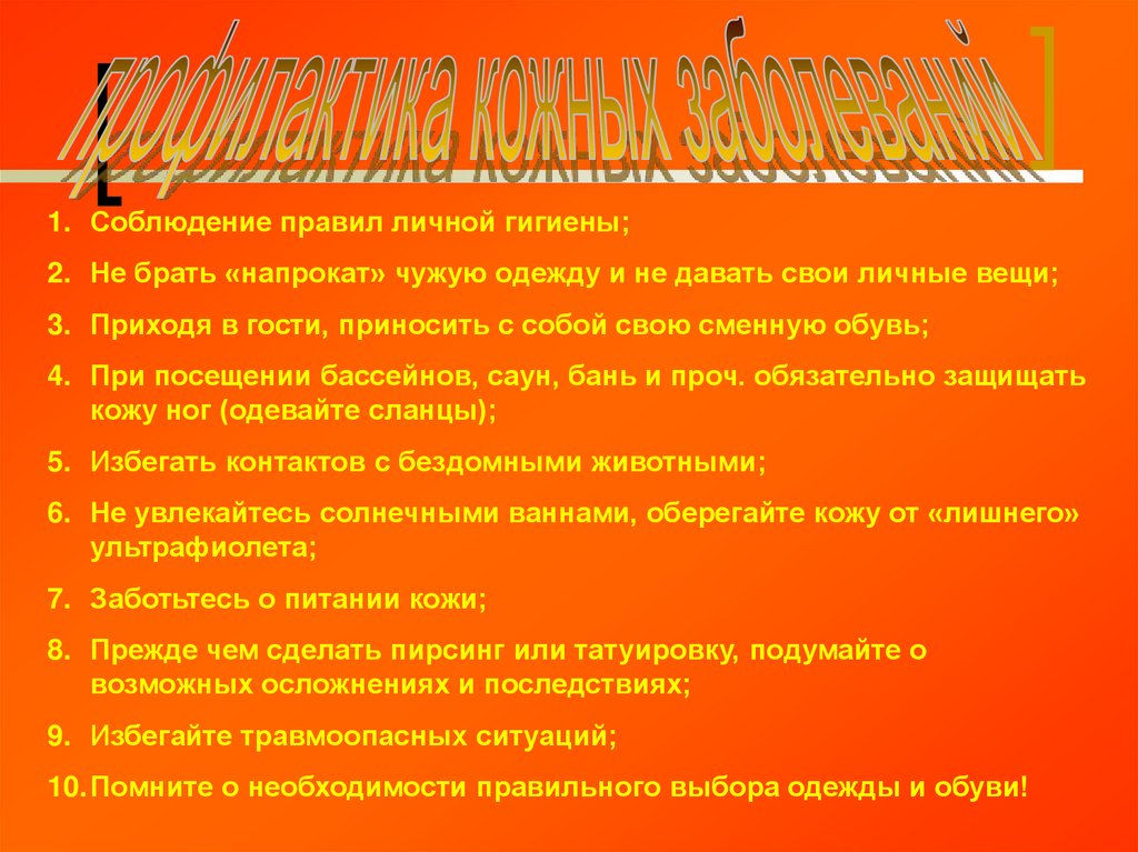 1. Соблюдение правил личной гигиены;2. Не брать «напрокат» чужую одежду и не давать свои личные вещи;