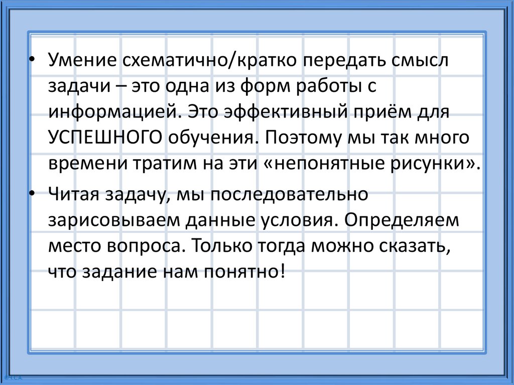 • Умение схематично/кратко передать смыслзадачи – это одна из форм работы с
