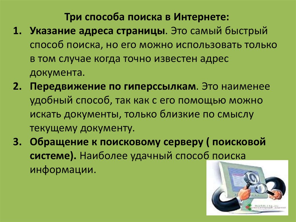 Три способа поиска в Интернете:1. Указание адреса страницы. Это самый быстрый