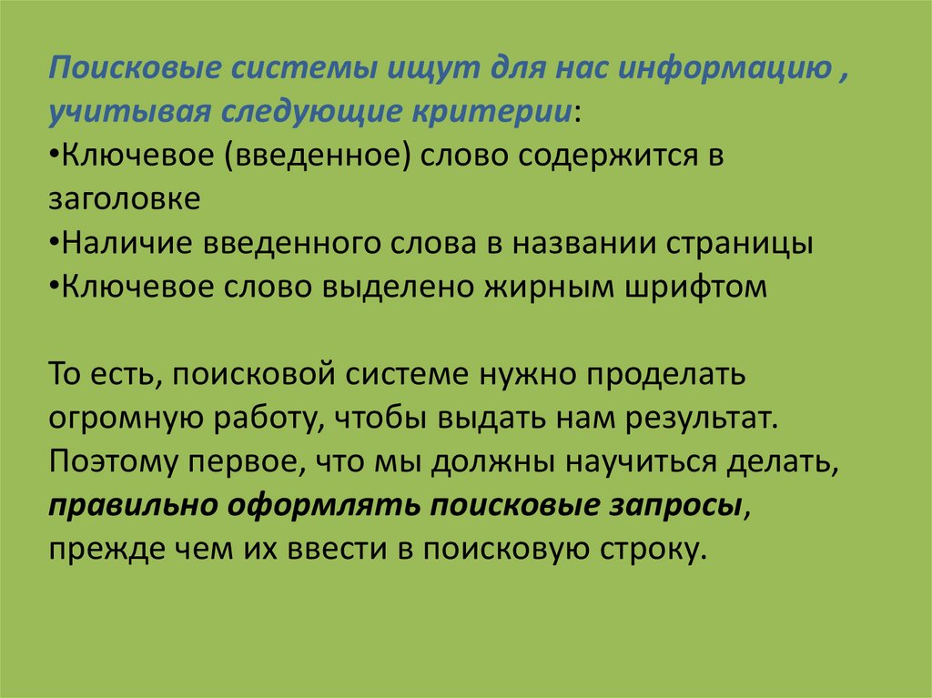 Поисковые системы ищут для нас информацию ,учитывая следующие критерии: