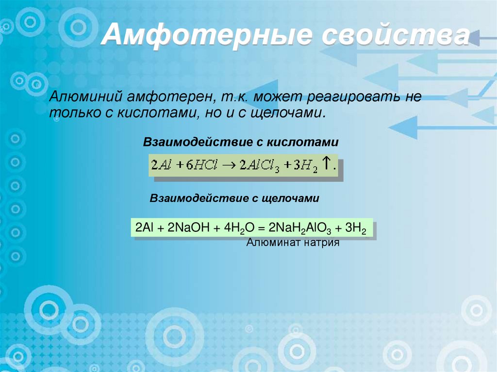 Амфотерные свойстваАлюминий амфотерен, т.к. может реагировать не