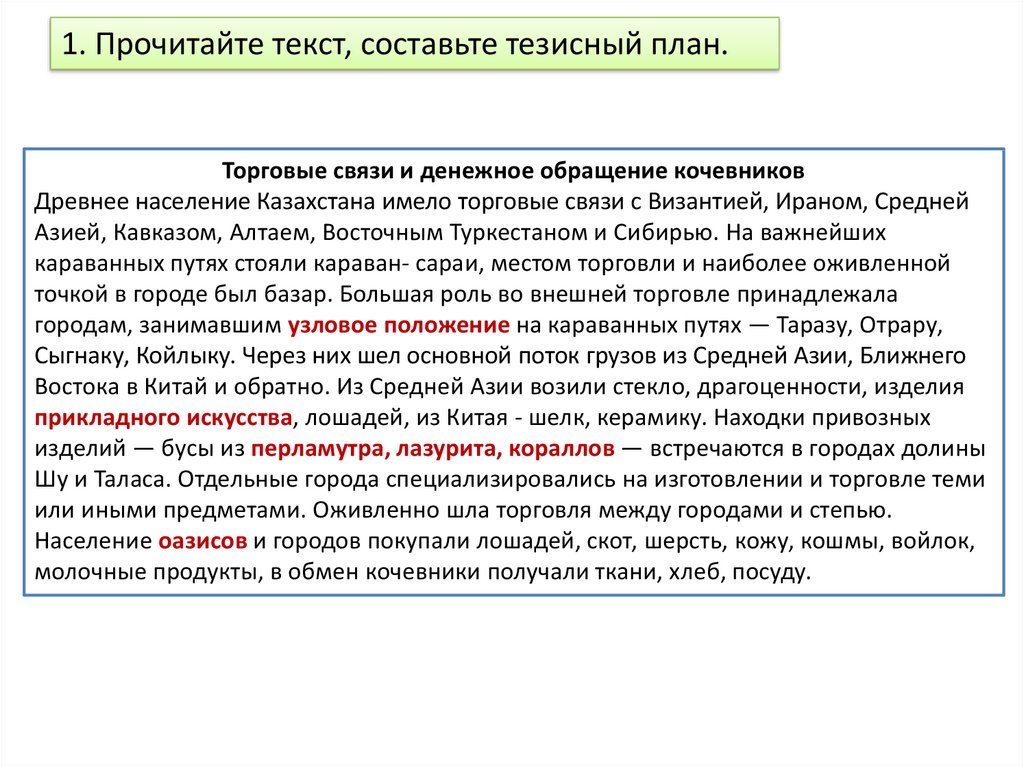 1. Прочитайте текст, составьте тезисный план.Торговые связи и денежное обращение кочевников