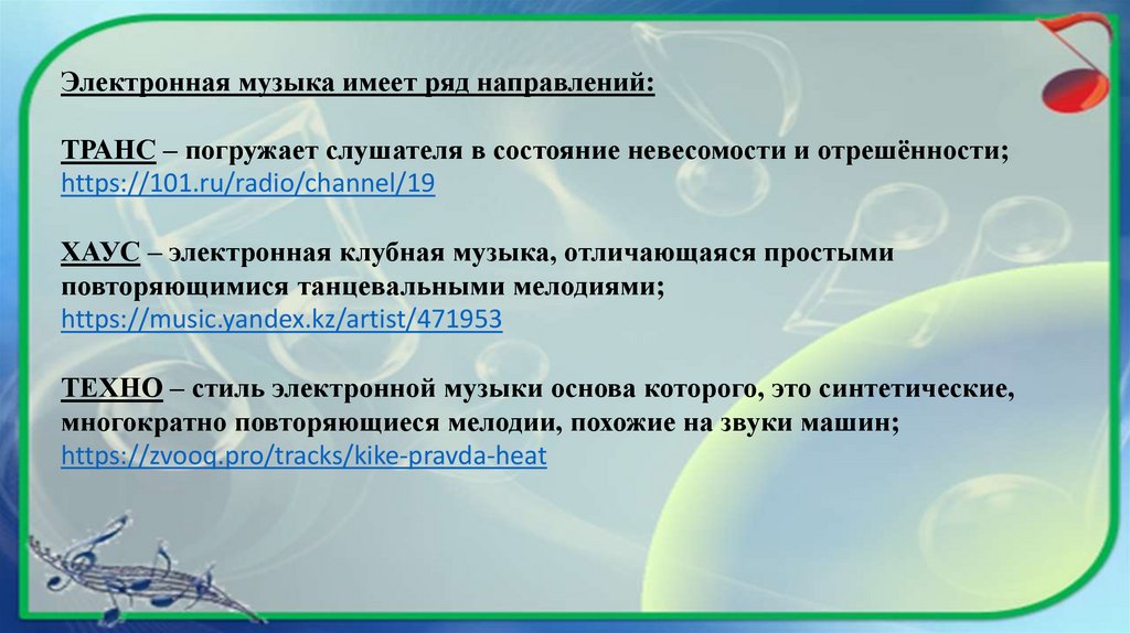 Электронная музыка имеет ряд направлений:ТРАНС – погружает слушателя в состояние невесомости и отрешённости;