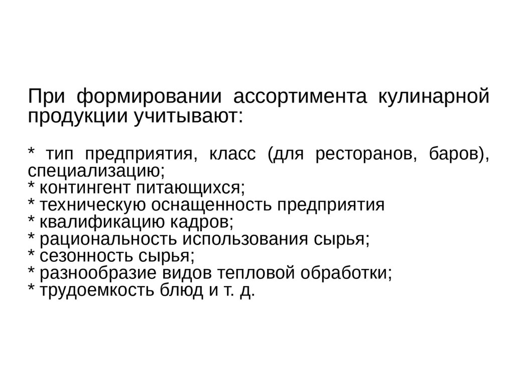 При формировании ассортимента кулинарнойпродукции учитывают: