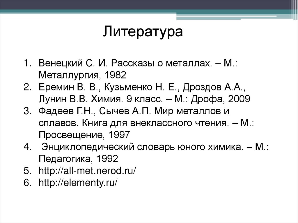 Литература1. Венецкий С. И. Рассказы о металлах. – М.: