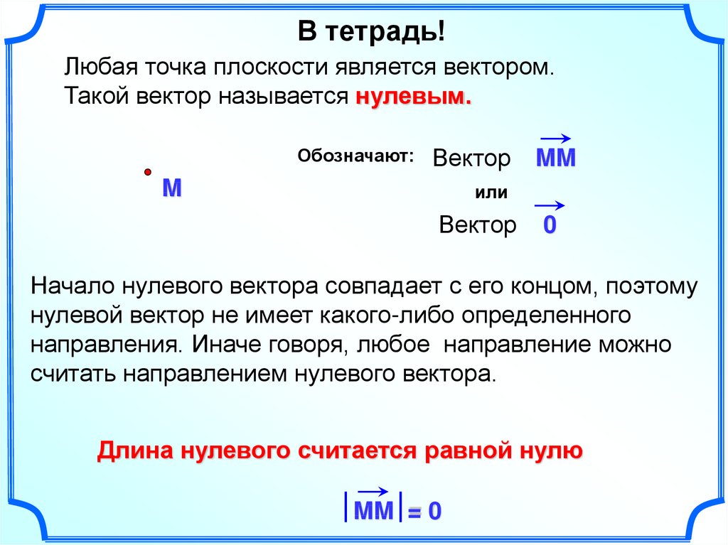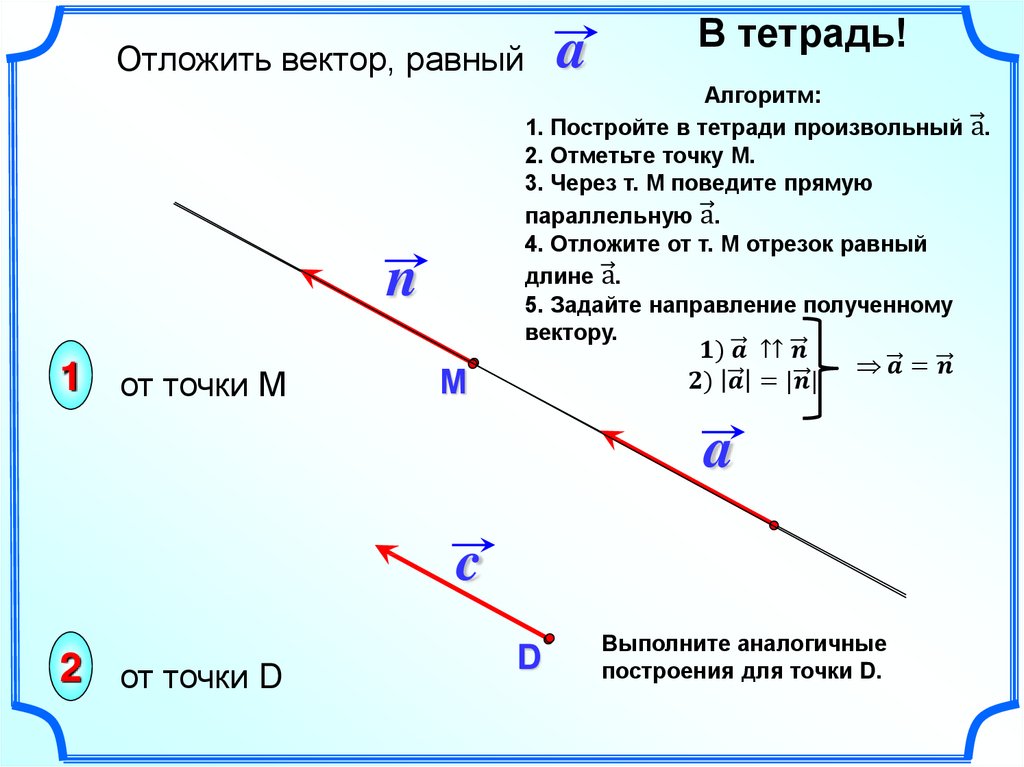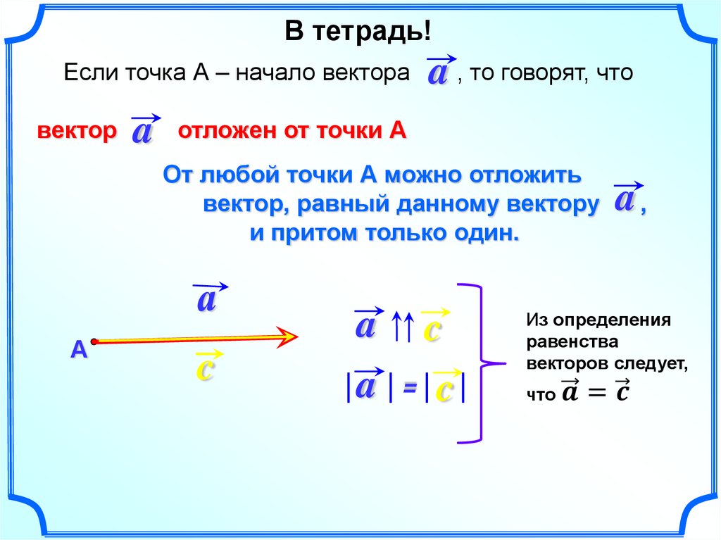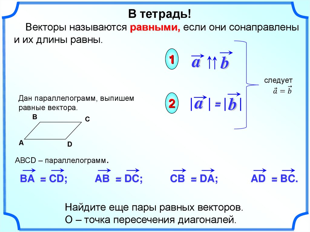 В тетрадь!Векторы называются равными, если они сонаправлены