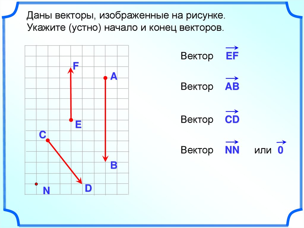 Даны векторы, изображенные на рисунке.Укажите (устно) начало и конец векторов.