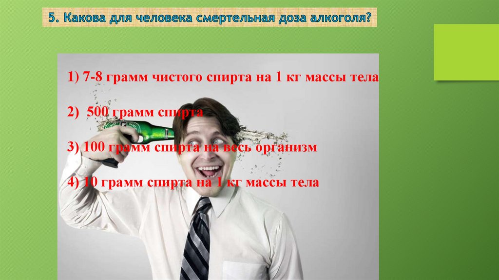 1) 7-8 грамм чистого спирта на 1 кг массы тела2) 500 грамм спирта