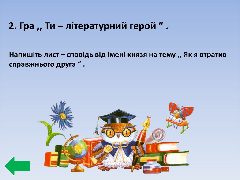 2. Гра ,, Ти – літературний герой ” .Напишіть лист – сповідь від імені князя на тему ,, Як я втратив