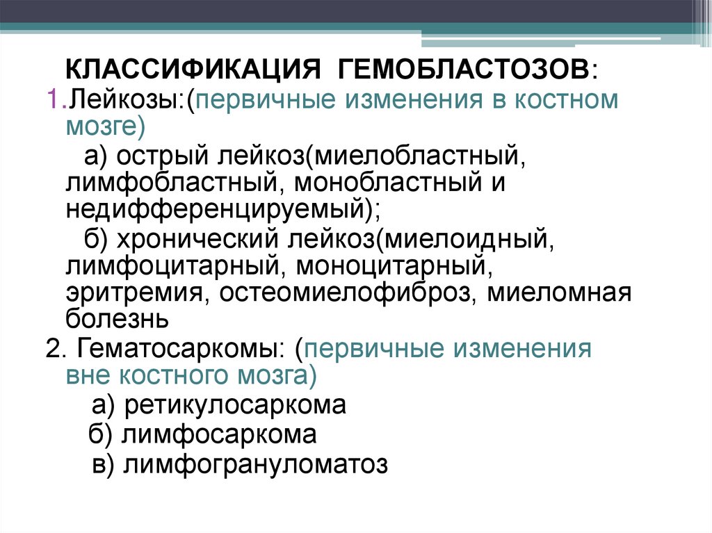 КЛАССИФИКАЦИЯ ГЕМОБЛАСТОЗОВ:1.Лейкозы:(первичные изменения в костном