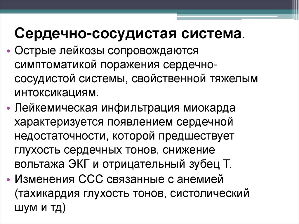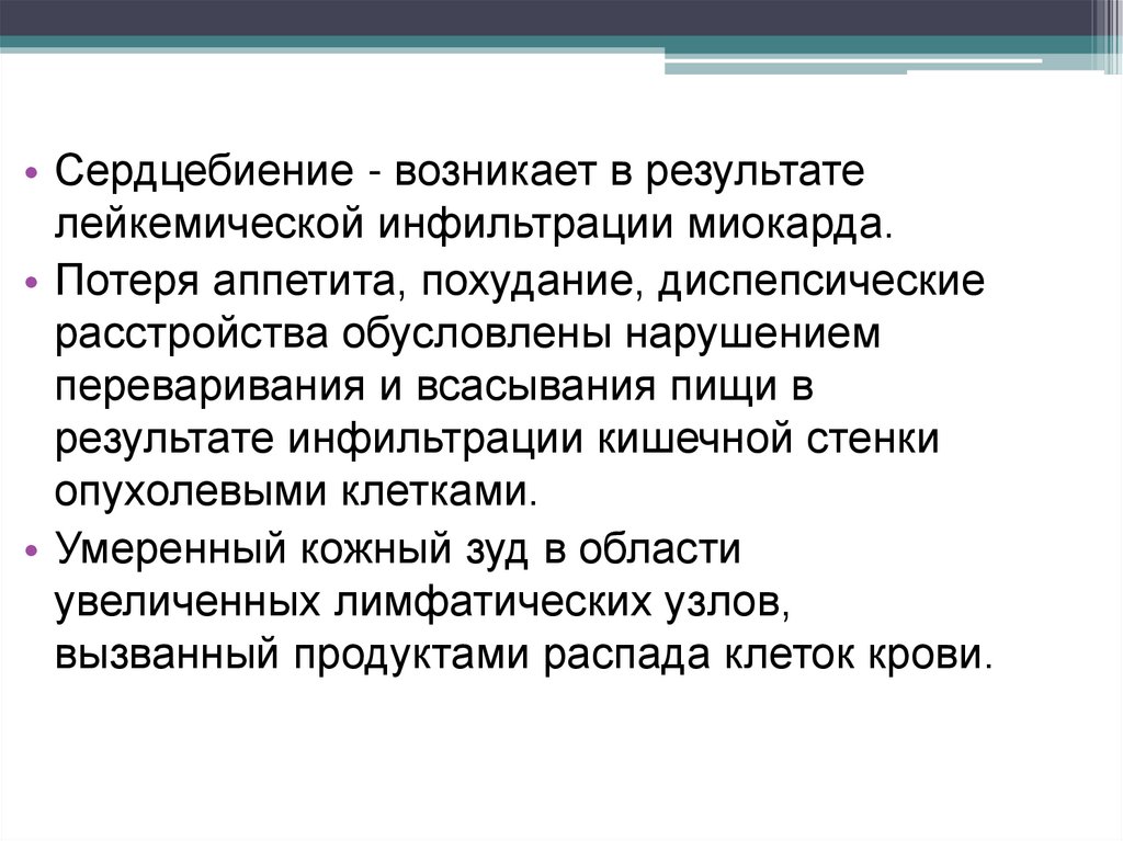 • Сердцебиение - возникает в результателейкемической инфильтрации миокарда.