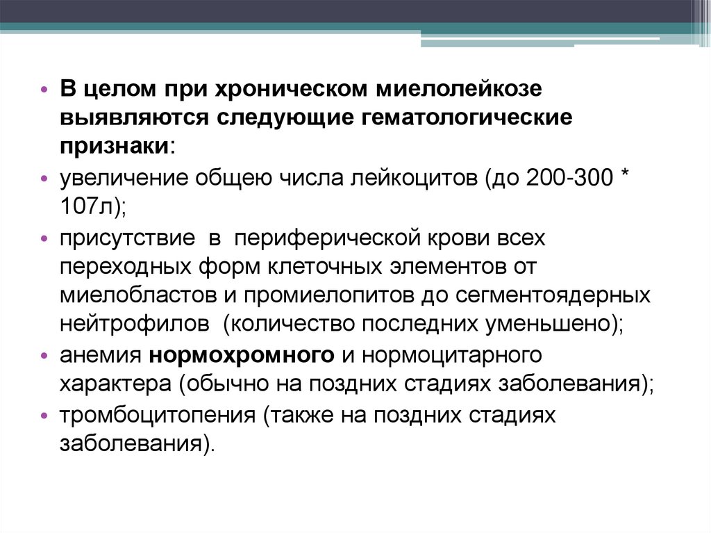 • В целом при хроническом миелолейкозевыявляются следующие гематологические
