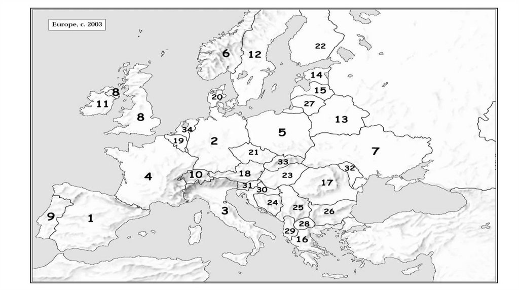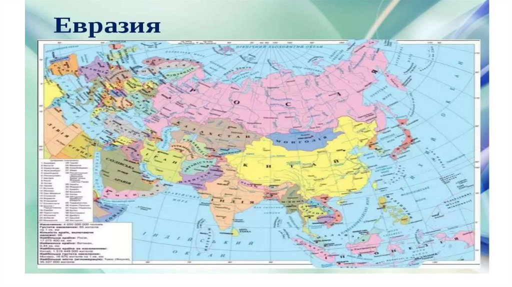 • 1. Изучите карту Евразии (политическую).• 2. Назовите страны под № 1 - 20 (смотри следующий слайд).