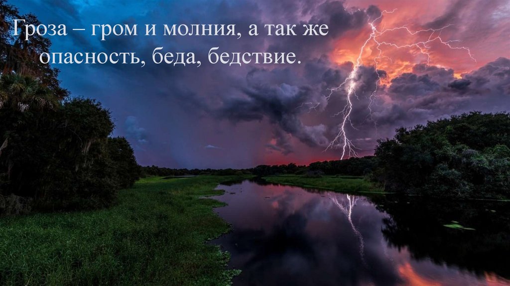 Гроза – гром и молния, а так жеопасность, беда, бедствие.