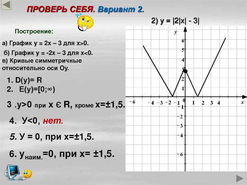 у=2|х|, у = √ х, y = |2|x| - 3| ,