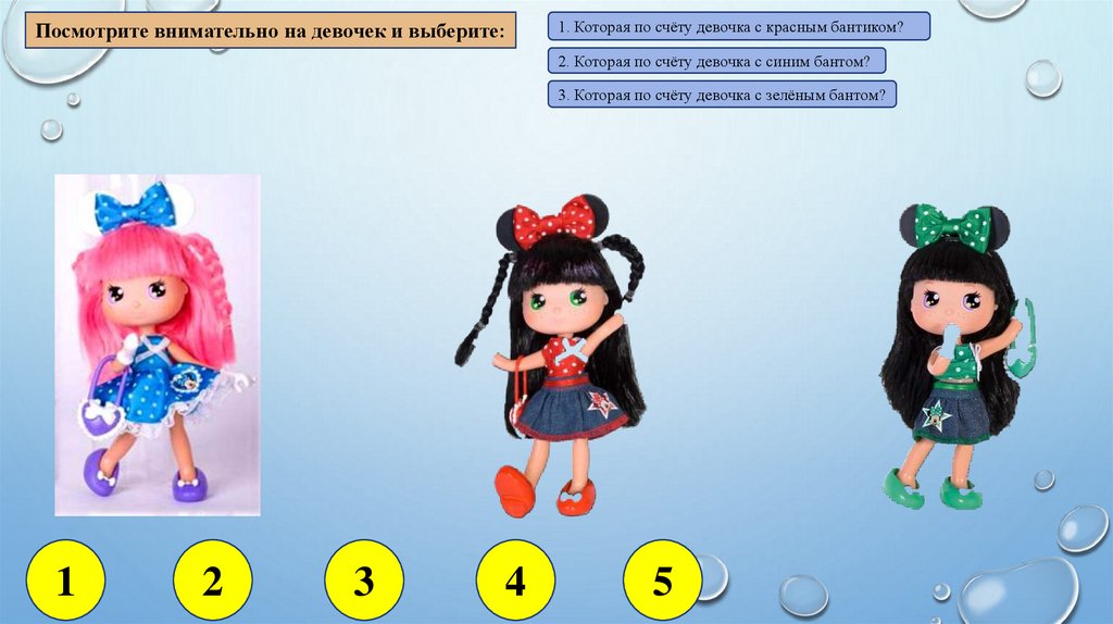 Посмотрите внимательно на девочек и выберите:1. Которая по счёту девочка с красным бантиком?